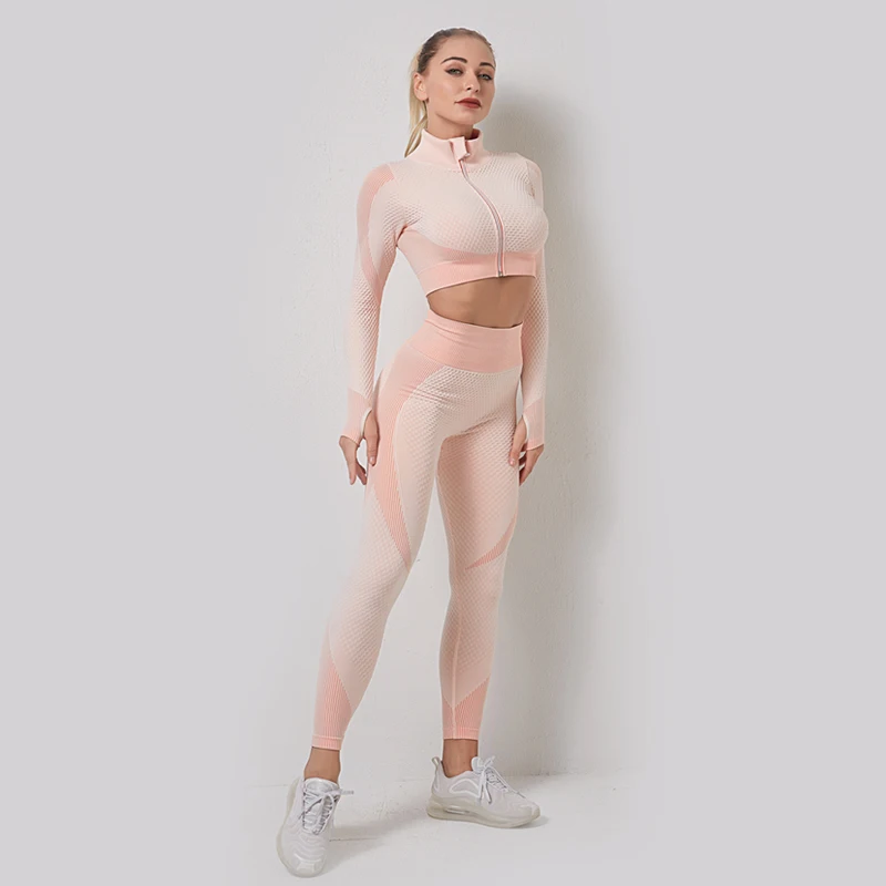 Seamless Women Long Sleeve Yoga Set Sportwear 2pcs Zipper Shirt Top+Leggings Fitness Workout Clothes for Women Gym Outfit,LF001